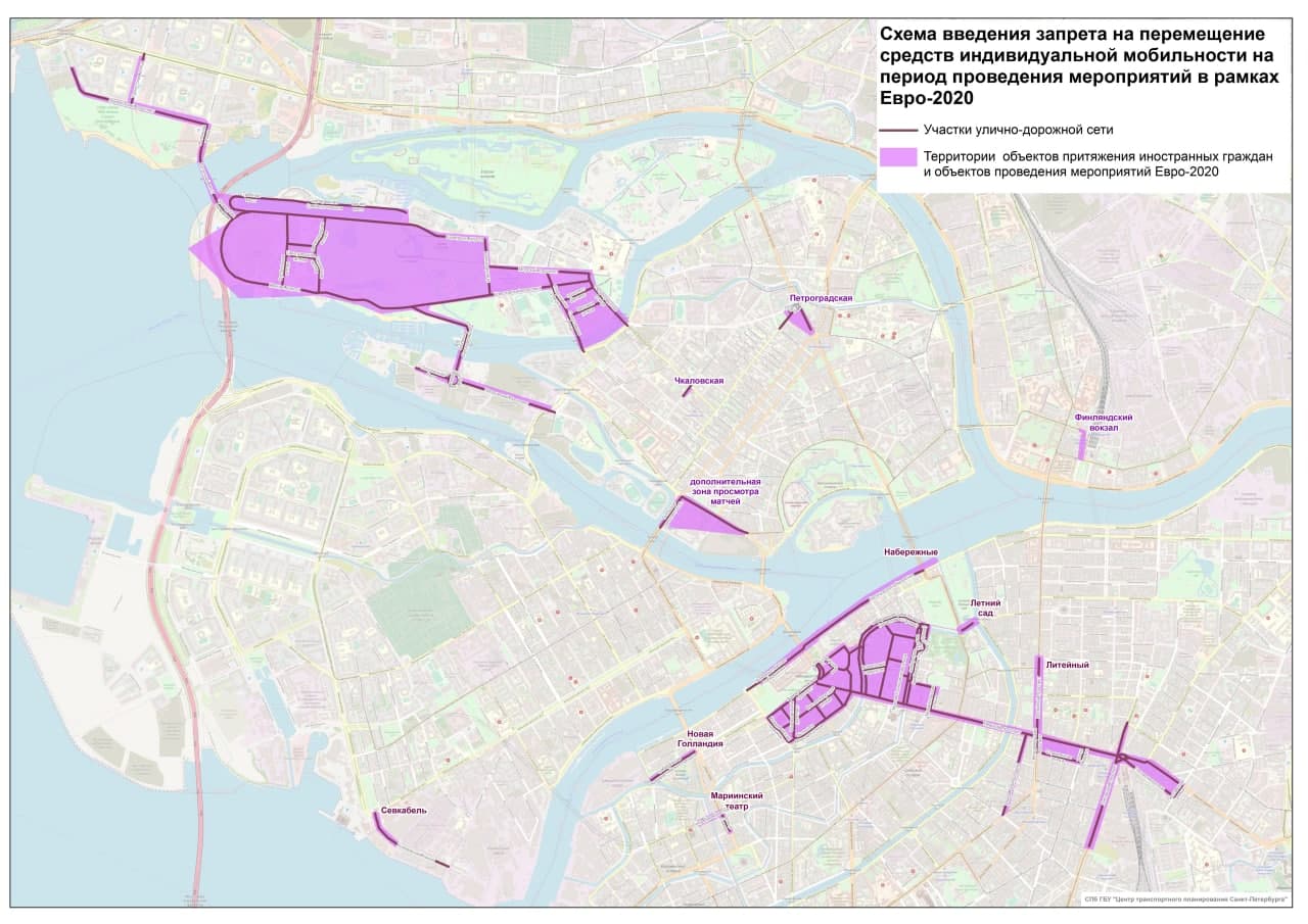 Движение и размещение самокатов будет запрещено постоянно на Дворцовой и Сенатской площадях и на Малой Морской улице, а на время Евро-2020 также дополнительно — на Невском проспекте, Дворцовой набережной, Английской набережной, Адмиралтейском проспекте, Большой Конюшенной улице и Большой Морской улице.
