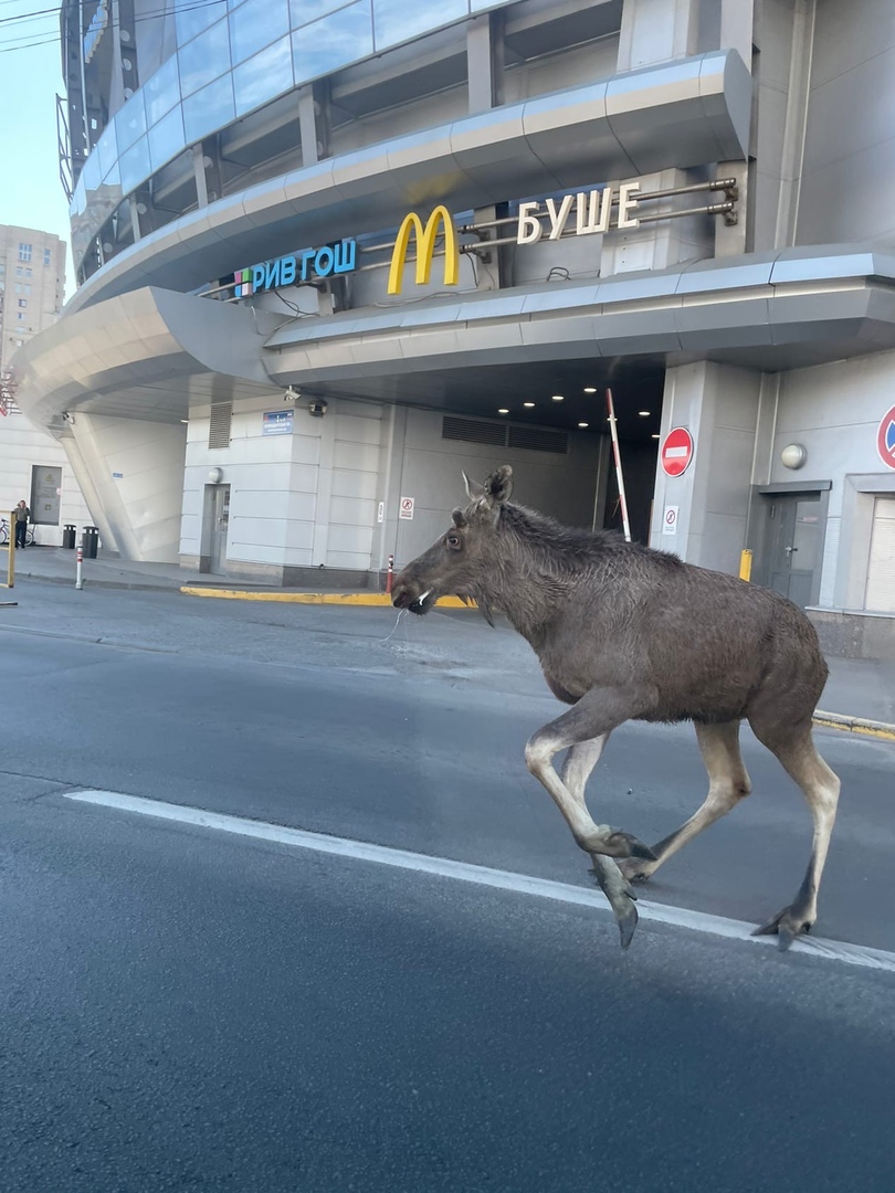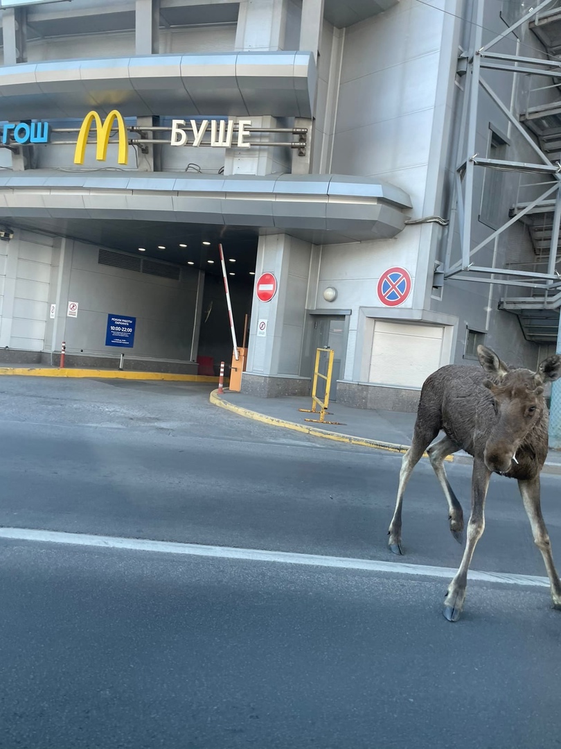 Комментаторы отмечают, что это еще лосенок. Однако он уже довольно крупный. Вот фотографии животного у «Макдональдса» на Комендантской площади.