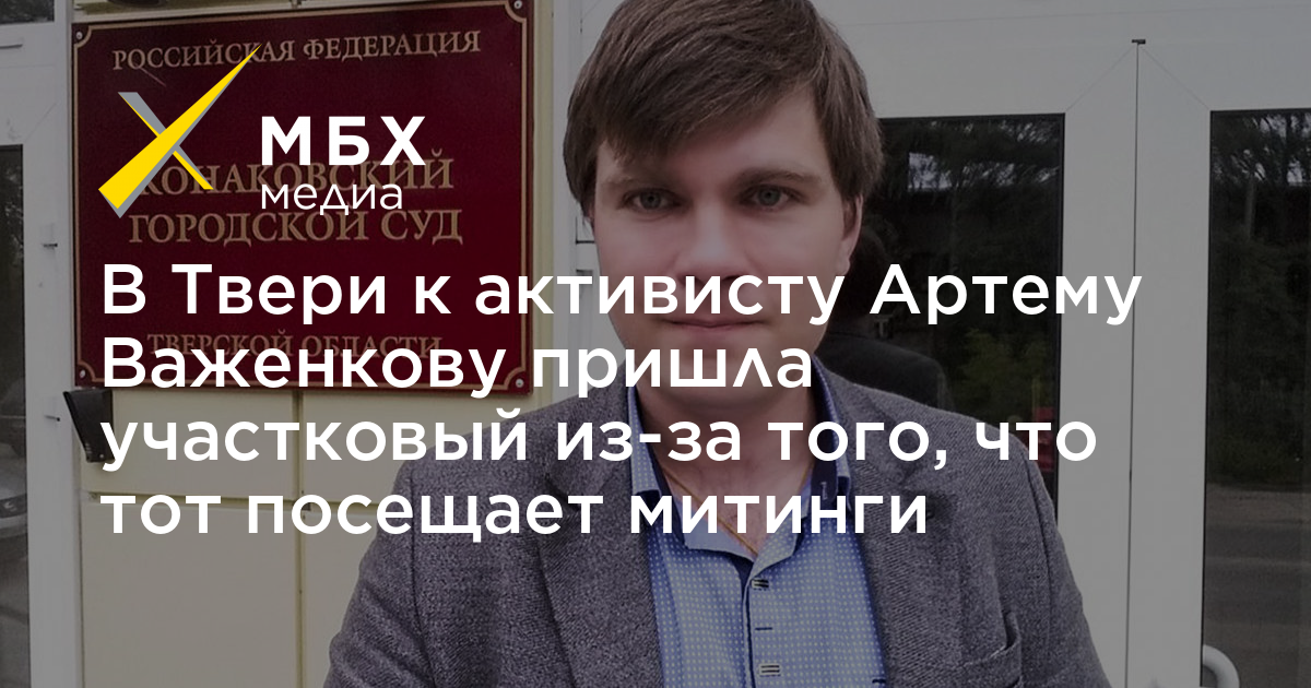 В Твери домой к активисту и экс-координатору ликвидированной «Открытой России» Артему Важенкову явилась участковый инспектор полиции из-за того, что Важенков «посещает митинги». Об этом «МБХ медиа» сообщил координатор «Правозащиты Открытки» Алексей Прянишников.