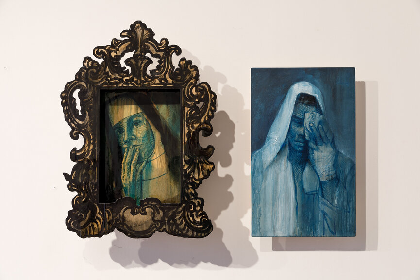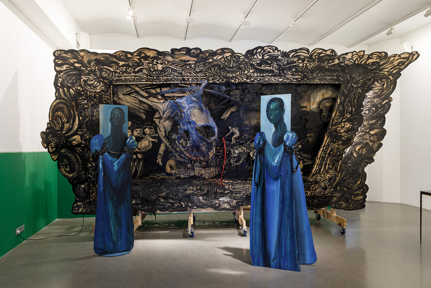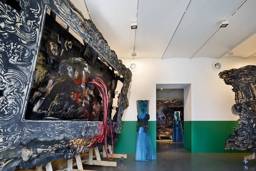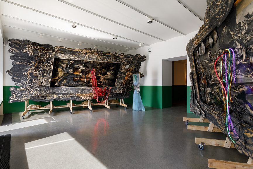 «Набережная рабов» и «Фламандская школа» — разные проекты, созданные в разное время. Тем не менее новая экспозиция была в определенной степени вдохновлена Венецианской биеннале: работы из двух серий роднят и темы, и любимый материал художника — фанера. Из нее сделаны не только сами работы, но и помпезные рамы для них. Сочетание образов старой культуры с прикладным материалом наделяет произведения некоторой самоиронией и превращает пышные орнаменты в своего рода эскизы.
