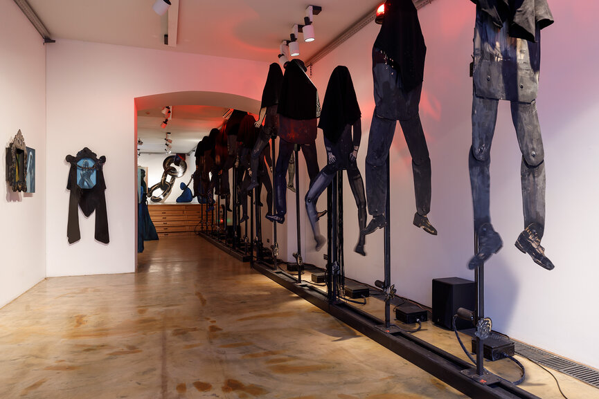 Во втором выставочном пространстве Marina Gisich Gallery можно увидеть новые работы художника. Открывается «Набережная рабов» довольно мрачной инсталляцией — механическим балетом с обезличенными человеческими фигурами, головы которых скрыты за мешками. Под тревожный красный свет и возгласы «Раз-два-три» они движутся вверх и вниз: постепенно движение затихает, а в финале фигуры поднимают вверх под печальную музыку — и снова опускают на землю.