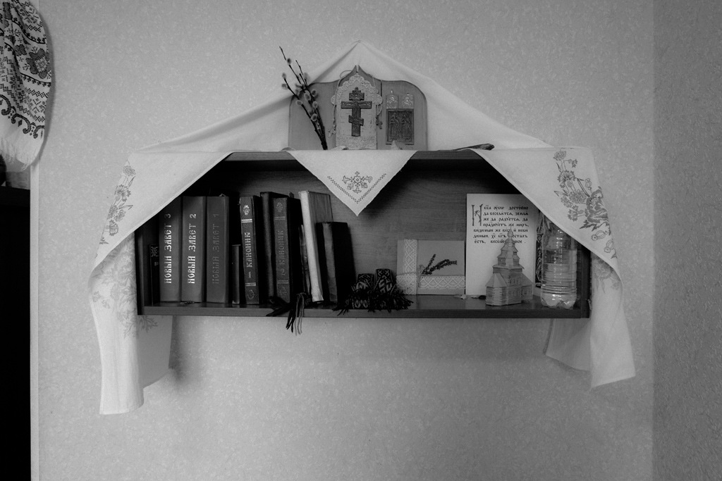 Через пару дней мы встречаемся с Романом в общежитии. В маленькой комнатке на несколько квадратных метров он живет, учится и молится. На полке над кроватью стоят тома Нового завета, Каноники, святая вода. Тут же — вышитый узором старообрядческий пояс, церквушка, которую Роман сам смастерил из спичек, распятие и веточка вербы. Под полкой лежит подрушник — специальный коврик для земных поклонов.