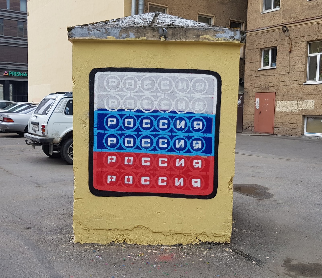 — На той самой будке, на Лиговском, 138, в День России, появилась новая работа. Это не наше. Кто нарисовал, не знаем. То, что будка стала жить своей жизнью, — круто.