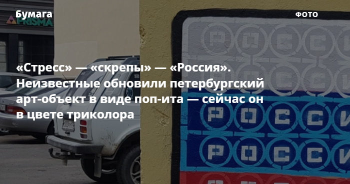 Неизвестные обновили арт-объект с нарисованным поп-итом на Лиговском проспекте, 138. Теперь на нем написано «Россия», он в цвете государственного триколора. Об этом 12 июня сообщили авторы изначальной работы — арт-группа «Явь».
