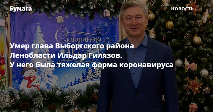 Утром 12 июня глава администрации Выборгского района Ленинградской области Ильдар Гилязов скончался в больнице. Об этом сообщил губернатор региона Александр Дрозденко.