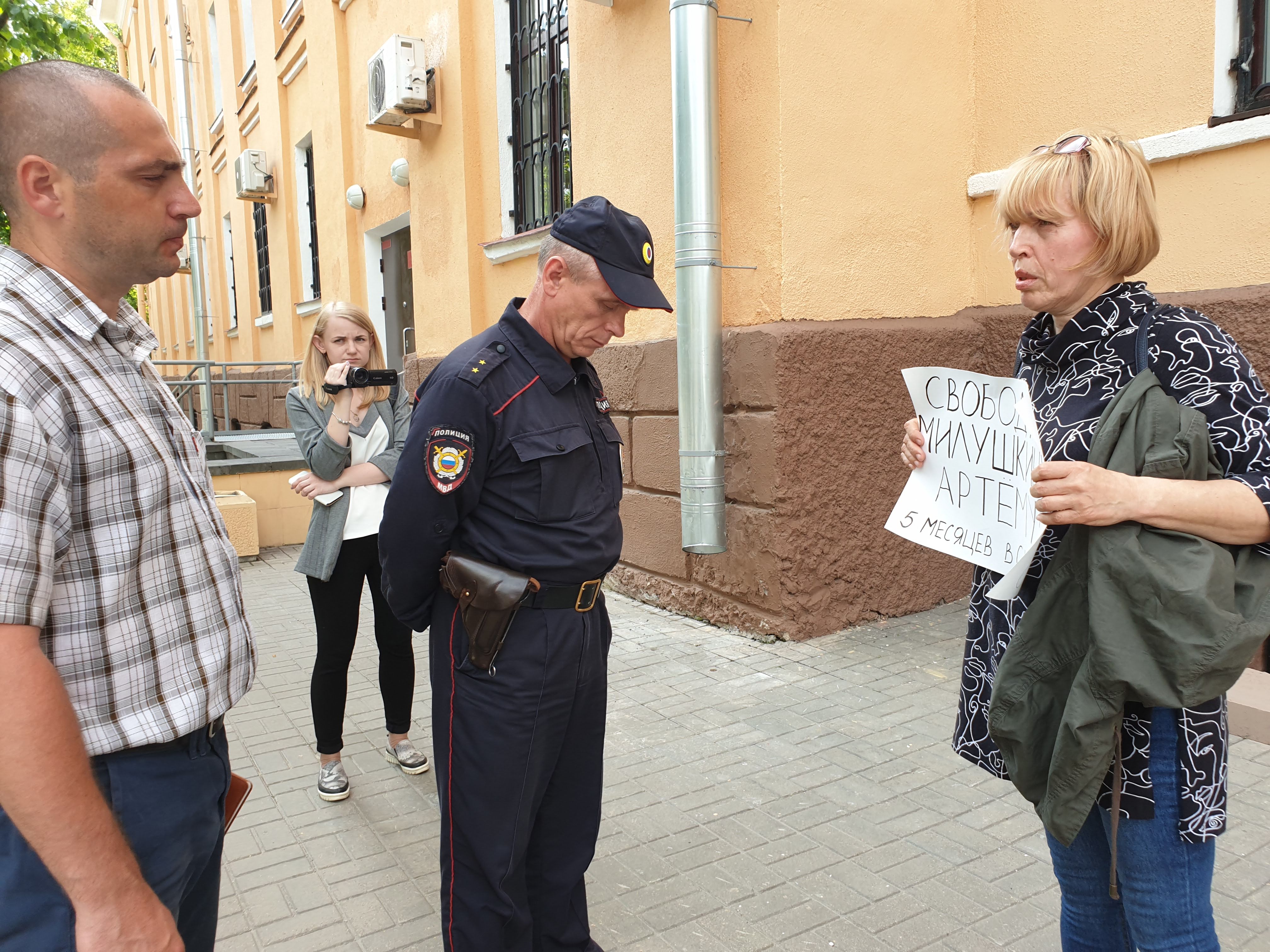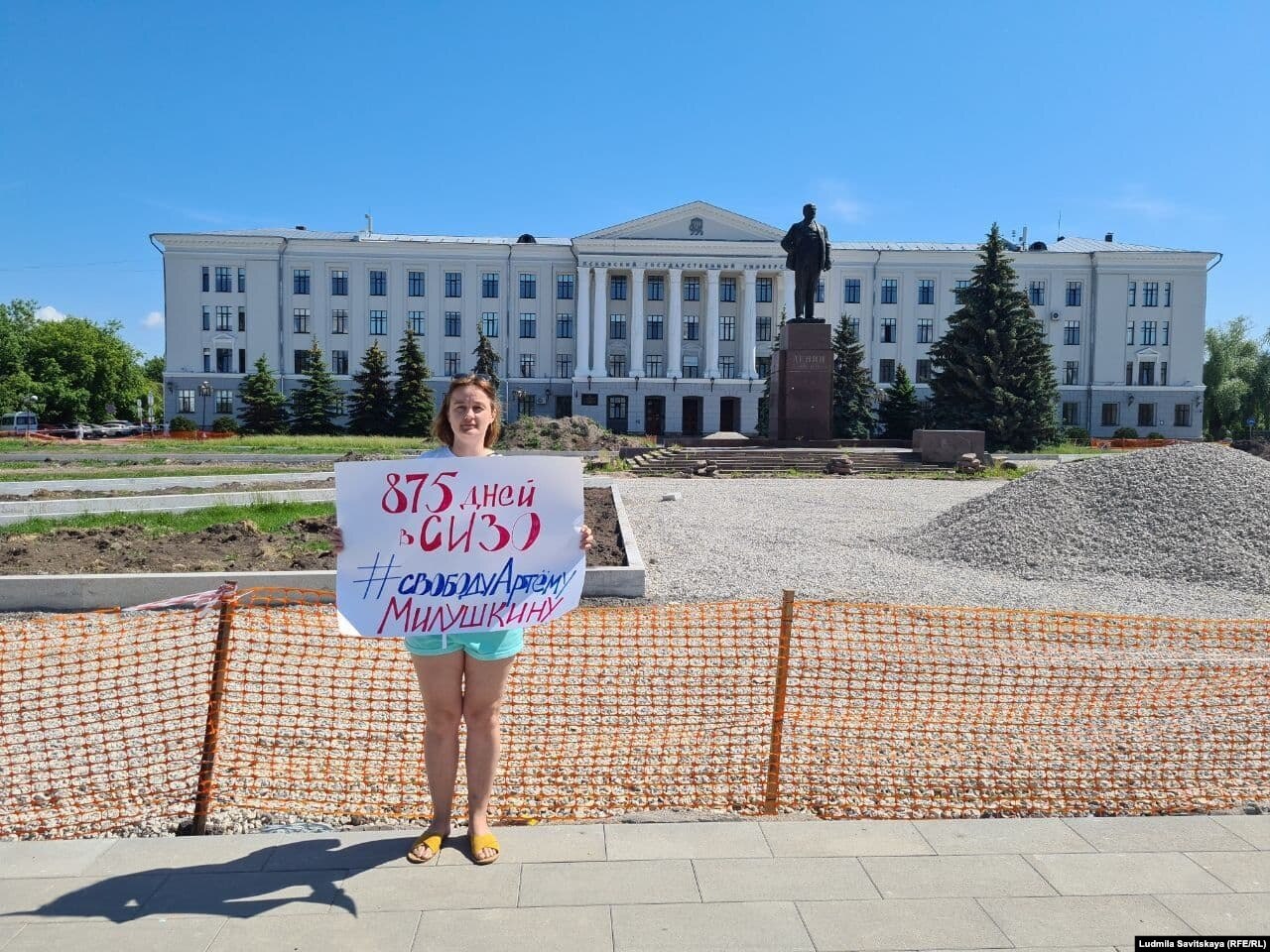 Новикова стояла в центре Пскова на площади Ленина с плакатом "875 дней в СИЗО. #СвободуАртемуМилушкину". Она объяснила, что решила выйти в пикет, потому что считает преследование семьи Милушкиных политическим.