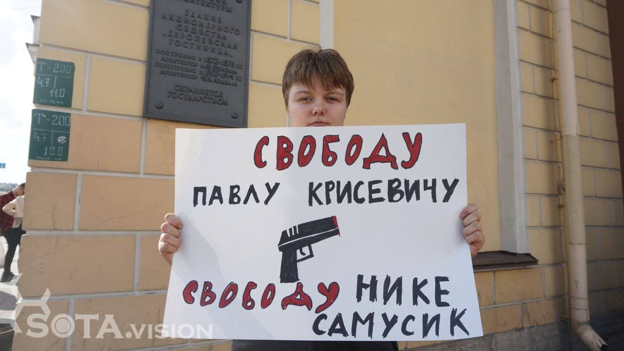В Петербурге активисты провели серию одиночных пикетов в поддержку акциониста Павла Крисевича и журналистки SOTA Ники Самусик. Одну из участниц – Марину-Викторию Нагорных – полицейские задержали. Об этом сообщили издания SOTA и "ОВД-Инфо".