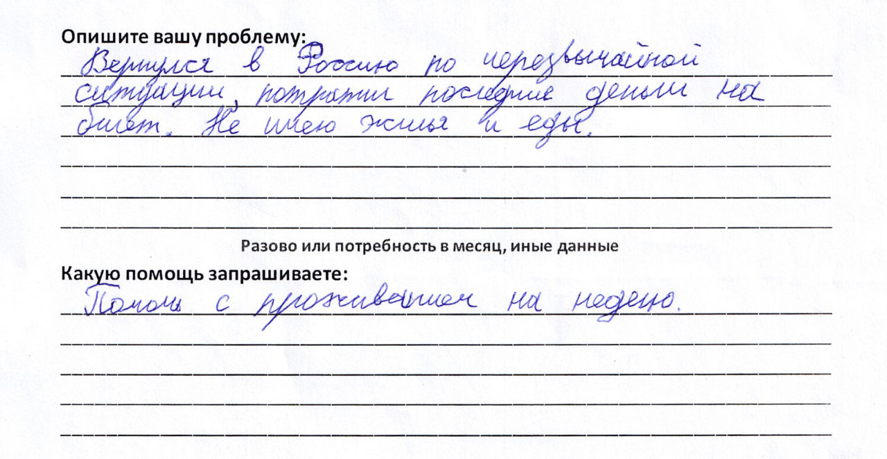 Вернулся в Россию по чрезвычайной ситуации; потерял последние деньги на билет. Не имею еды и жилья. Помочь с проживанием на неделюФото: Ольга Матвеева Проект «Кризисный центр» родился на базе благотворительного кластера «Анна помогает» в начале 2020 года. Проект задумывался как место, куда могут обратиться за помощью люди, попавшие в сложную жизненную ситуацию.