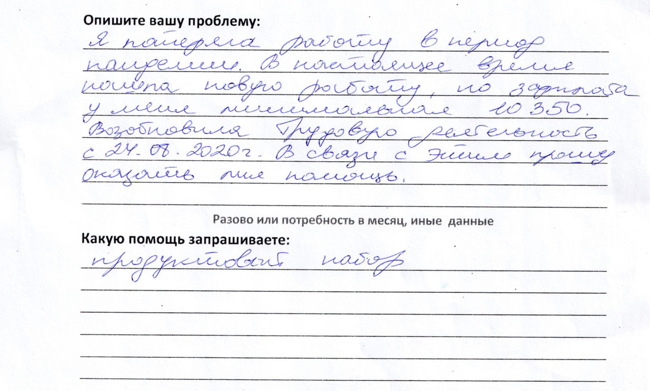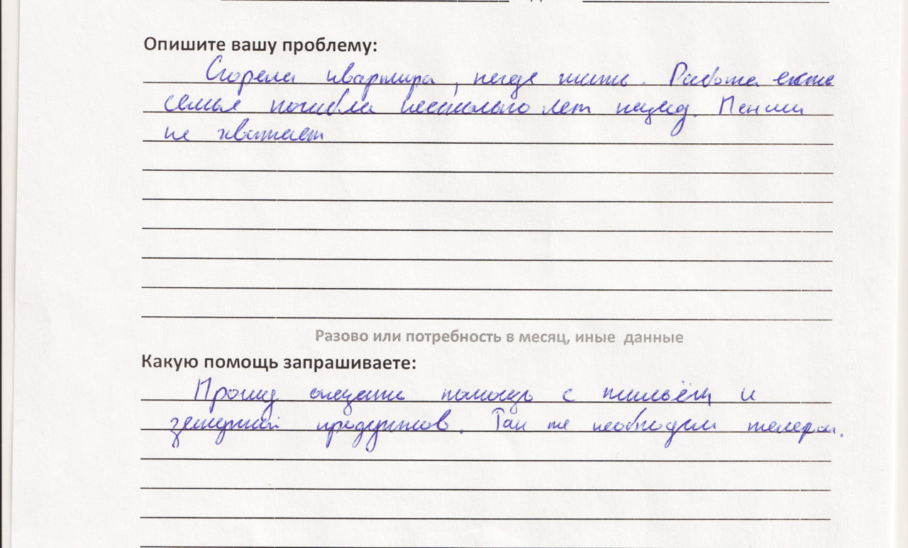 «А вот еще случай. Пожилая женщина, тоже за восемьдесят, врач. Пенсия у нее минимальная, много денег уходило на лекарства. Пытались помочь ей продуктами, но на момент получения этих продуктов бабушка умерла. Мы тогда анкету переписали на ее дочку. Она вернулась из Азербайджана, у нее там муж умер от инсульта. Последние полгода ухаживала за мамой, тоже вся больная, никаких льгот. Ну как этой семье не помочь?»