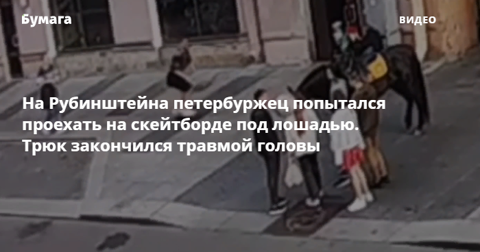 На записи видно, что петербуржец ехал на скейтборде по тротуару. На его пути стояла лошадь. Мужчина пригнулся, чтобы проехать под ней. Животное испугалось и резко начало движение, когда скейтбордист был под ним. Молодой человек попал под копыта и упал на землю.