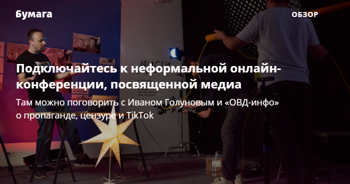 Подключайтесь к неформальной онлайн-конференции, посвященной медиа. Там можно поговорить с Иваном Голуновым и «ОВД-инфо» о пропаганде, цензуре и TikTok