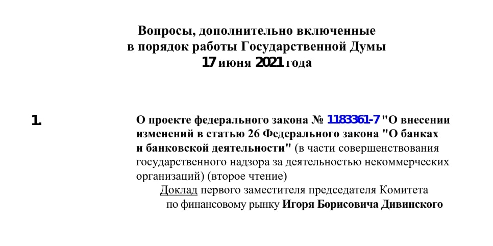Госдума приняла сразу во втором и третьем чтениях закон, который обязывает банки предоставлять Минюсту по его запросу доступ к финансовым документам некоммерческих организаций (НКО). Соответствующий документ за номером №1183361-7 был внесён Правительством РФ в конце мая текущего года.