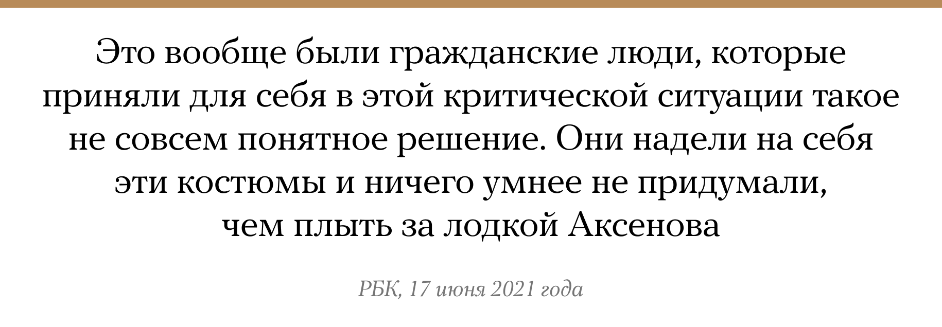 17 июня агенство РИА Новости показало видео с главой Крыма Сергеем Аксеновым, который приехал осматривать подтопленную из-за сильных дождей Керчь и, в частности, посетил местную больницу. На видео заметно, что за моторной лодкой Аксенова плывут три человека. Советник главы Крыма Олег Крючков заявил, что эти люди — сотрудники МЧС. По его словам, в городе не хватает лодок, поэтому спасатели вплавь добирались до больницы и случайно попали в кадр. Но в пресс-службе МЧС по Крыму утверждают, что люди на видео — это не сотрудники ведомства, а гражданские лица, которые «надели на себя эти костюмы и ничего умнее не придумали, чем плыть за лодкой Аксенова».