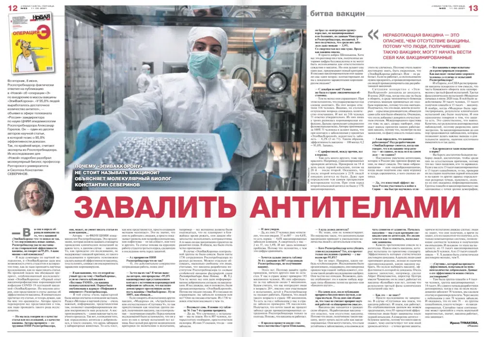 «Создатели вакцины, научные сотрудники новосибирского Государственного научного центра вирусологии и биотехнологии (ГНЦ) «Вектор», скромно называли свое детище самой безопасной и, да что там, самой действенной вакциной в мире. Эффективность оценивали в 100 процентов. Так и говорили: сто».