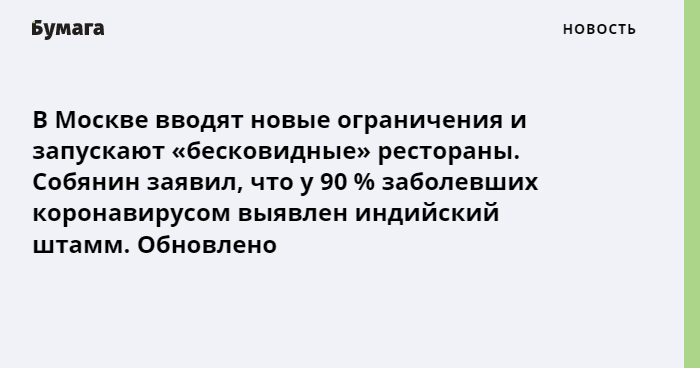 В Москве вводят новые ограничения и запускают «бесковидные» рестораны. Собянин заявил, что у 90 % заболевших коронавирусом выявлен индийский штамм. Обновлено