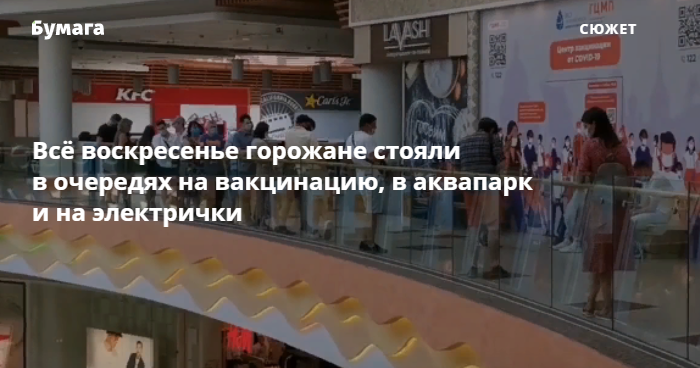 В Петербурге 20 июня стало днем толп. Десятки горожан выстраивались в очередь на вакцинацию в торговых центрах, не меньше пытались успеть в аквапарк до его закрытия из-за новых ограничений. Давка образовалась в пригородных электричках, в черте города пляжи тоже забиты под завязку.