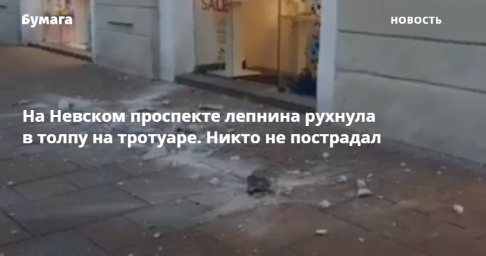 На Невском проспекте на прохожих рухнул фрагмент лепнины. Видео момента обрушения опубликовало издание 78.ru.