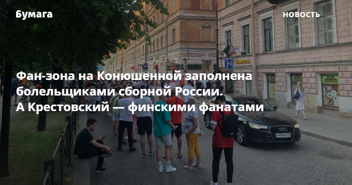 На Конюшенной площади перед трансляцией матча сборных России и Дании собрались 3 тысячи болельщиков. На Крестовском — сотни фанатов из Финляндии и Бельгии, команды играют на «Газпром Арене».