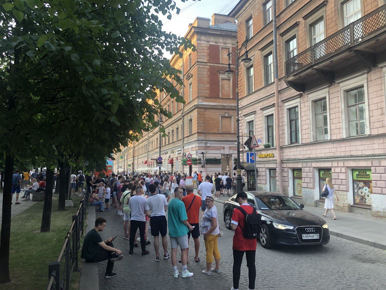 На входе на Конюшенную площадь образовалась большая очередь. Прежде футбольная деревня вмещала 5 тысяч человек, но 20 июня лимит ограничили до 3 тысяч. В 21:17 организаторы сообщили о том, что фан-зона достигла предела вместимости. Фанатам рекомендуют идти в парк футбола у «Юбилейного» — правда, там сейчас установлен лимит в 1 тысячу человек.
