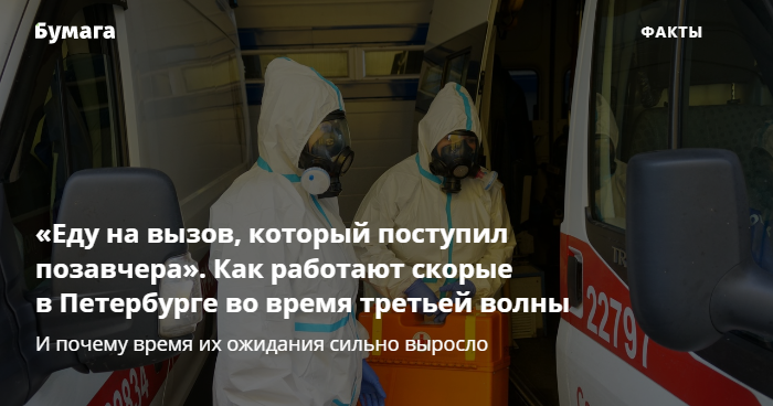 «Бумага» поговорила с двумя медиками из районной скорой помощи Петербурга. Один подтвердил, что время ожидания скорой сейчас может растянуться до 24 часов, второй сообщил о сроке до трех суток. Первый отметил, что работает на правом берегу Невы. Второй же ездит на вызовы в Красносельском районе, но там, по его словам, проблемы со временем ожидания неотложки были и до пандемии.