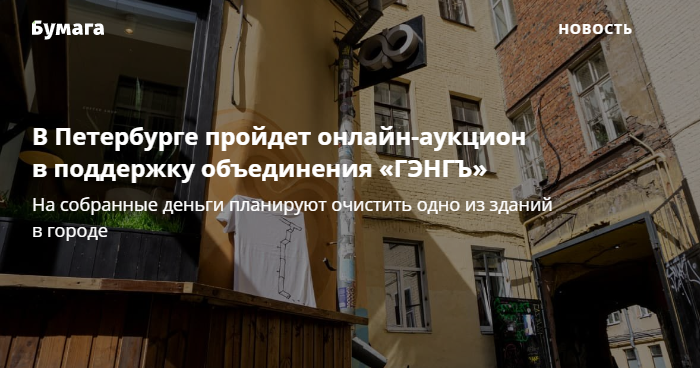 В Петербурге с 28 июня по 7 июля пройдет онлайн-аукцион в поддержку краеведческого объединения «Гэнгъ». Собранные деньги пойдут на очистку одного из зданий в городе. Об этом «Бумаге» сообщили организаторы акции.