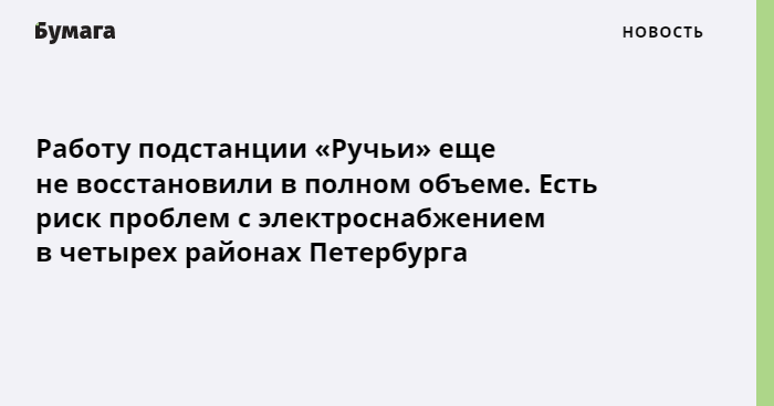 Последствия аварии на подстанции «Ручьи» еще не устранили. Из-за этого есть риск проблем с электроснабжением в четырех районах города, сообщили «Бумаге» в пресс-службе «Россети Ленэнерго».