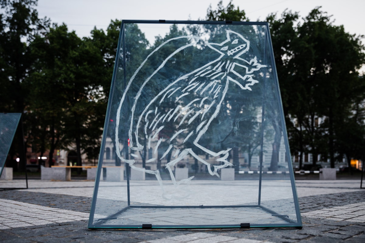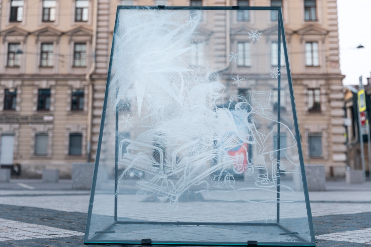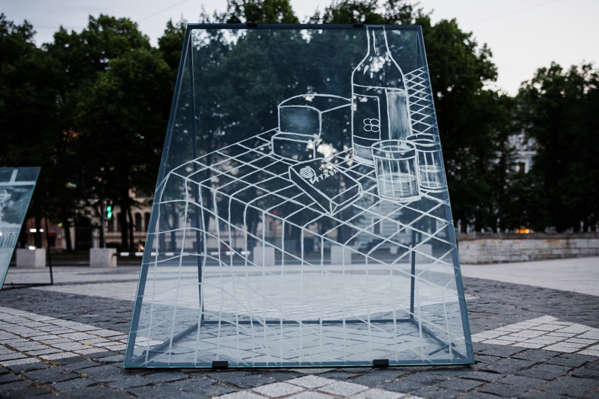 Скретчинг считают одной из самых вандальных форм уличного искусства, но в данном случае этот метод попытались «перетянуть на светлую сторону», говорит Максим Има. Приглашенные им художники — Владимир Абих, Покрас Лампас, Марина Колдобская и другие авторы — создали арт-объекты из стекла, выцарапав на материале различные изображения: от женской фигуры до натюрморта с сырком «Дружба».