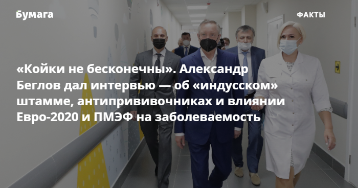 В интервью Беглов сказал, что в Петербург пришел «новый штамм, его называют индийский или индусский штамм». Губернатор заявил, что распространение этого штамма «в десять раз выше, чем прошлого вируса». К тому же, как сказал Беглов, «он еще сильнее, и он мутирует». Из-за этого чаще болеют молодые люди.