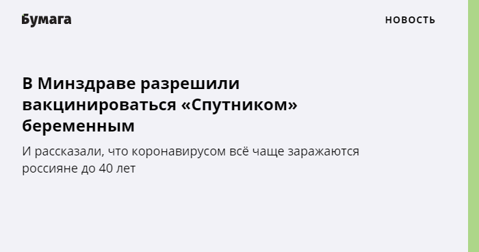 Минздрав также разрешил прививать вакциной «Спутник V» беременных, сообщил Мурашко. Ранее прививка была им противопоказана. По словам министра, решение принято с учетом положительных результатов клинических исследований и накопленных данных по эффективности и безопасности вакцины.