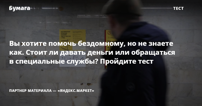 Что вы знаете о жизни бездомных? Как можно поддержать человека, оставшегося без жилья, и насколько разумно давать ему деньги или предлагать пожить у себя? Пройдите тест, который «Бумага» составила вместе с Яндекс.Маркетом и благотворительным фондом «Ночлежка».