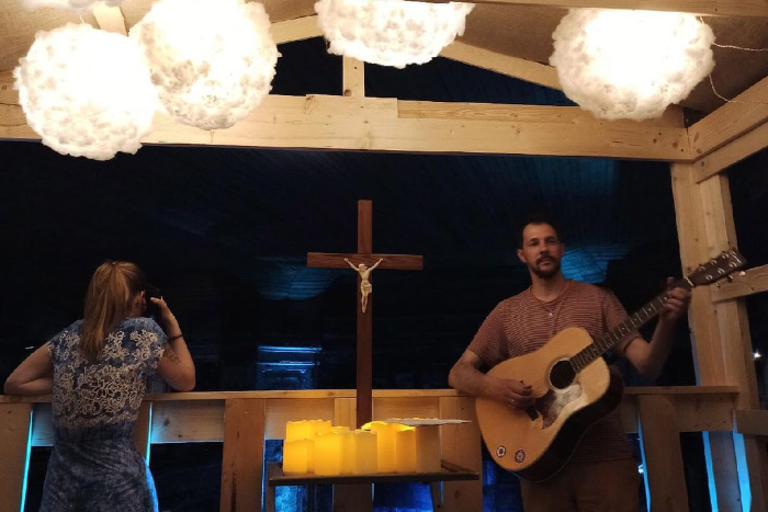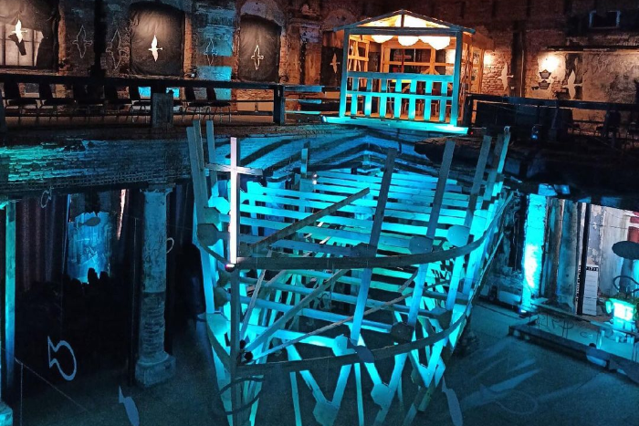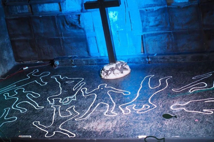 В храме построили масштабный макет ковчега, подвесили сахарные облака, радугу, нарисовали белые силуэты людей и начали транслировать морскую видеопроекцию, где можно научиться «ходить по воде».