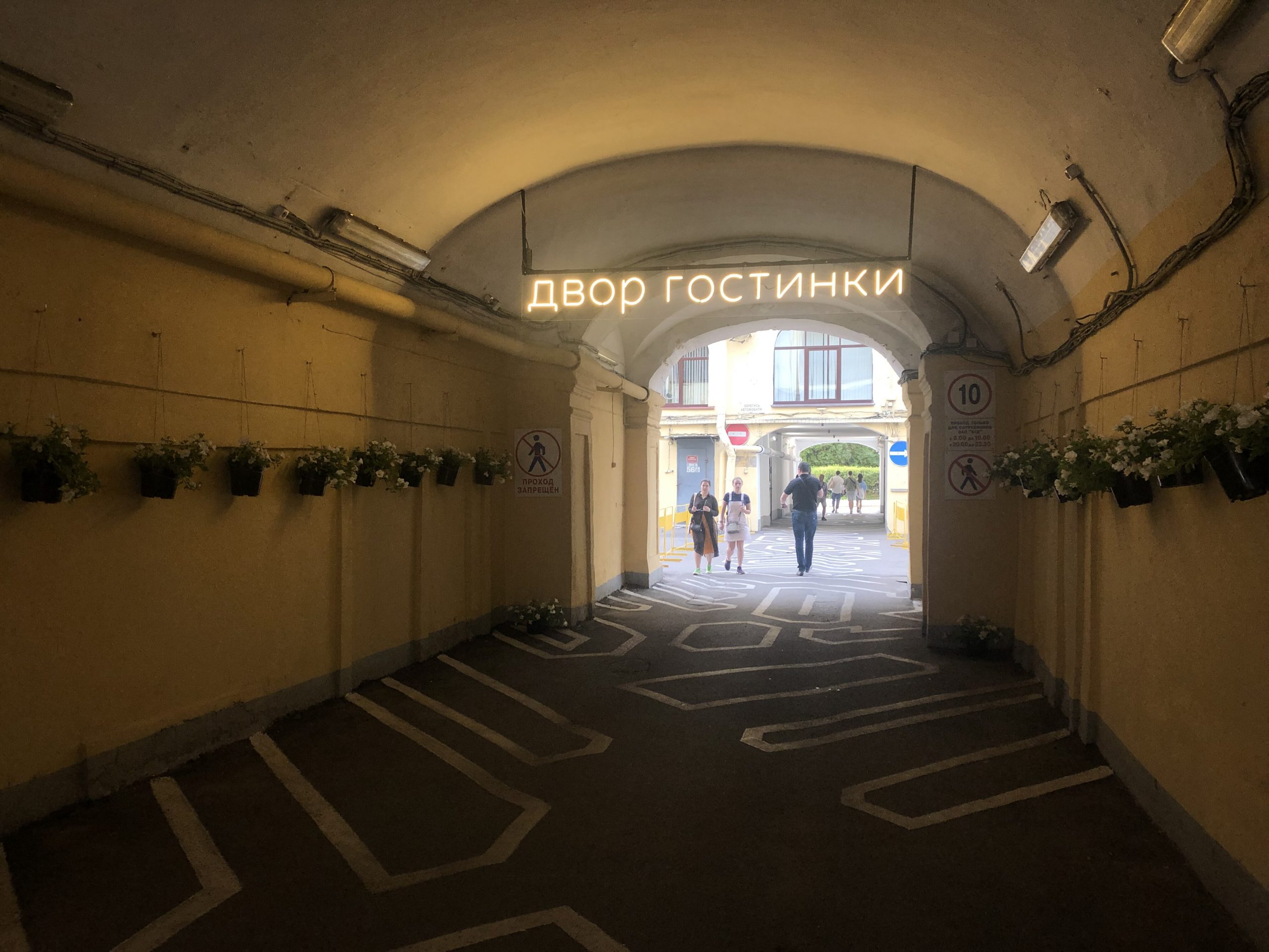 — <…> Годами эта громадина для большинства из нас была скорее названием станции метро, чем магазином или точкой притяжения. Город в городе без применения и смысла. Урбанистическое преступление. Но чудеса случаются. Нашлась команда мечты и момент готовности администрации идти в будущее. Начало положено и рожден «Двор Гостинки», вход в арку напротив дома 26 по Садовой улице. Пространства-уголки в разной стилистике, но все с душой. Можно выпить, поесть, покачаться на качелях, пофоткаться, посидеть у фонтана, погладить котиков, привести песика.
