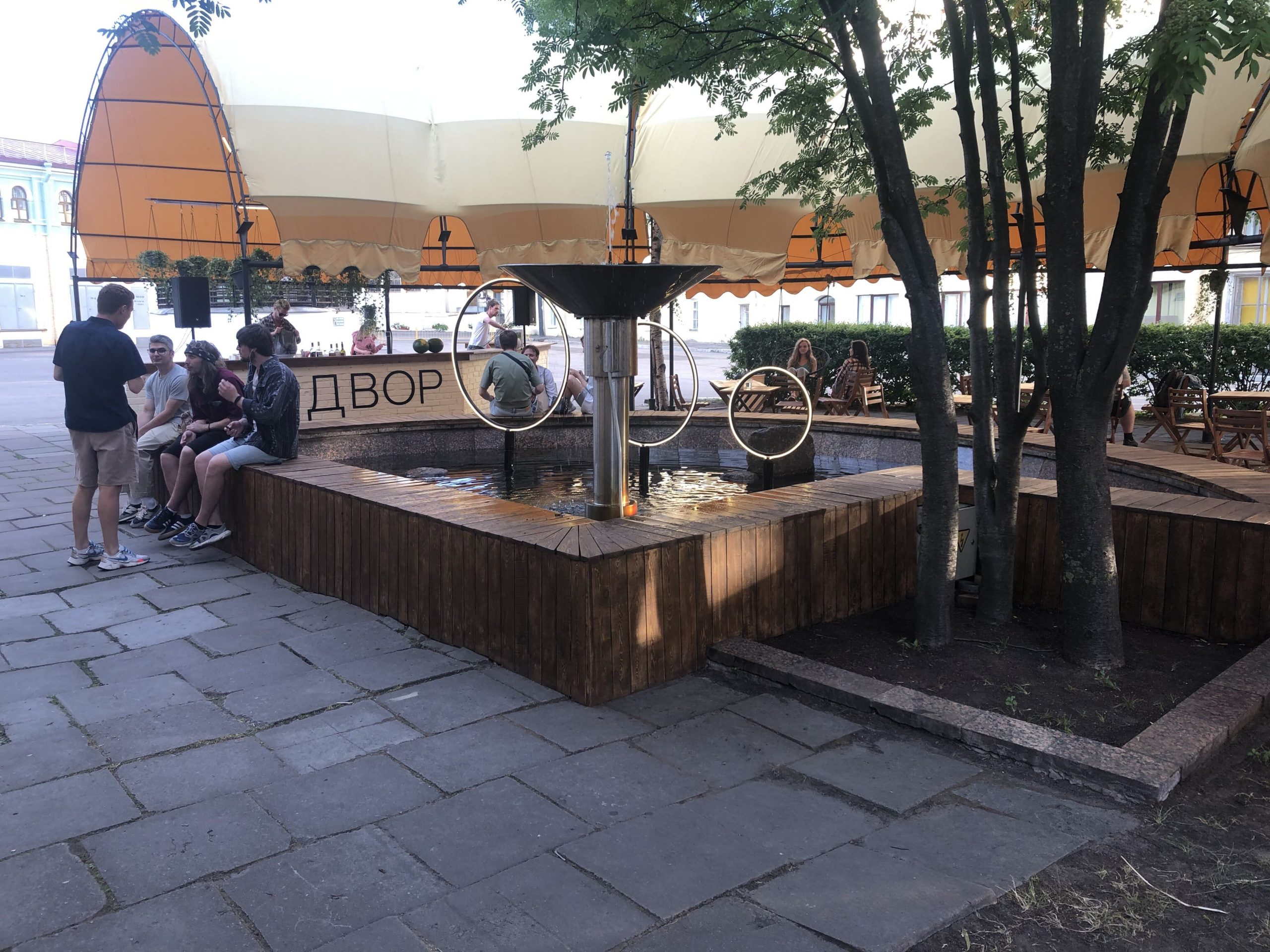 Рядом — небольшая зона со скамейками, качелями, деревьями и фонтаном, где можно укрыться от дождя или зноя.