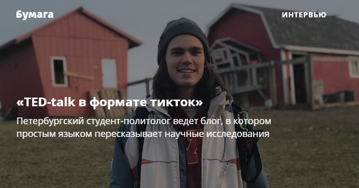 Петербуржец Михаил Петров ведет блог «TED-talk в формате тикток», в котором простым языком пересказывает научные исследования из авторитетных источников на общественно-политические темы. Например, об эффективности контрактной армии и мирных протестов, а также о влиянии фэтфобии на зарплату.