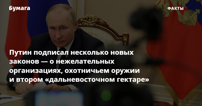 Президент России Владимир Путин 28 июня подписал несколько новых законов, которые касаются работы нежелательных организаций, лицензий на оружие и продажи ювелирных украшений на международных выставках. «Бумага» рассказывает о новых правилах.