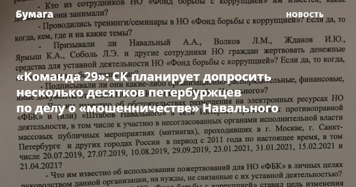 Главное следственное управление СК по Петербургу планирует вызвать около 50 человек на допрос по делу о «мошенничестве» Алексея Навального, сообщает «Команда 29». Объединение утверждает, что ознакомилось с полным списком вопросов, которые будут задавать на допросе.