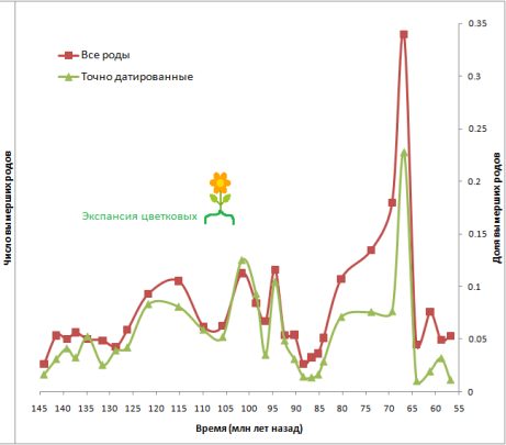Рис. 4 На левом графике (рис. 3) — скорость вымирания на родовом уровне морской фауны: животные плюс протисты за вычетом одноклеточных водорослей. Точки идут с шагом около трех миллионов лет — точнее датировать не удается. Лучшая точность достижима только в уникальных локальных разрезах, но не для глобальных данных. Резкий спад на рисунке соответствует мел-палеогеновому рубежу. Цветочек я поместил там, где была экспансия цветковых.