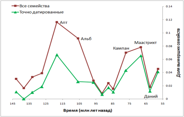 Главное, на что нужно обратить внимание, — это огромный горб в середине мела, Апт и Альб, представляющий среднемеловой биоценотический кризис, о котором много писал Владимир Васильевич Жерихин. В середине мела произошла глобальная смена растительности, которая повлекла за собой глобальную смену насекомых и тетрапод. Это была грандиозная биотическая перестройка на суше; в море в это время ничего радикального не произошло. Это было не массовое вымирание — на смену вымершим родам приходили новые. Однако нас интересует рубеж мела — палеогена (маастрихта и дания). Красная линия представляет все семейства, а зеленая — только датированные с точностью до яруса. Если мы выкинем неточно датированные семейства, то маастрихиский пик в самом конце мела становится более резким. Причем основной вклад в этот пик дали позвоночные, и почти никакого вклада не дали насекомые и растения.