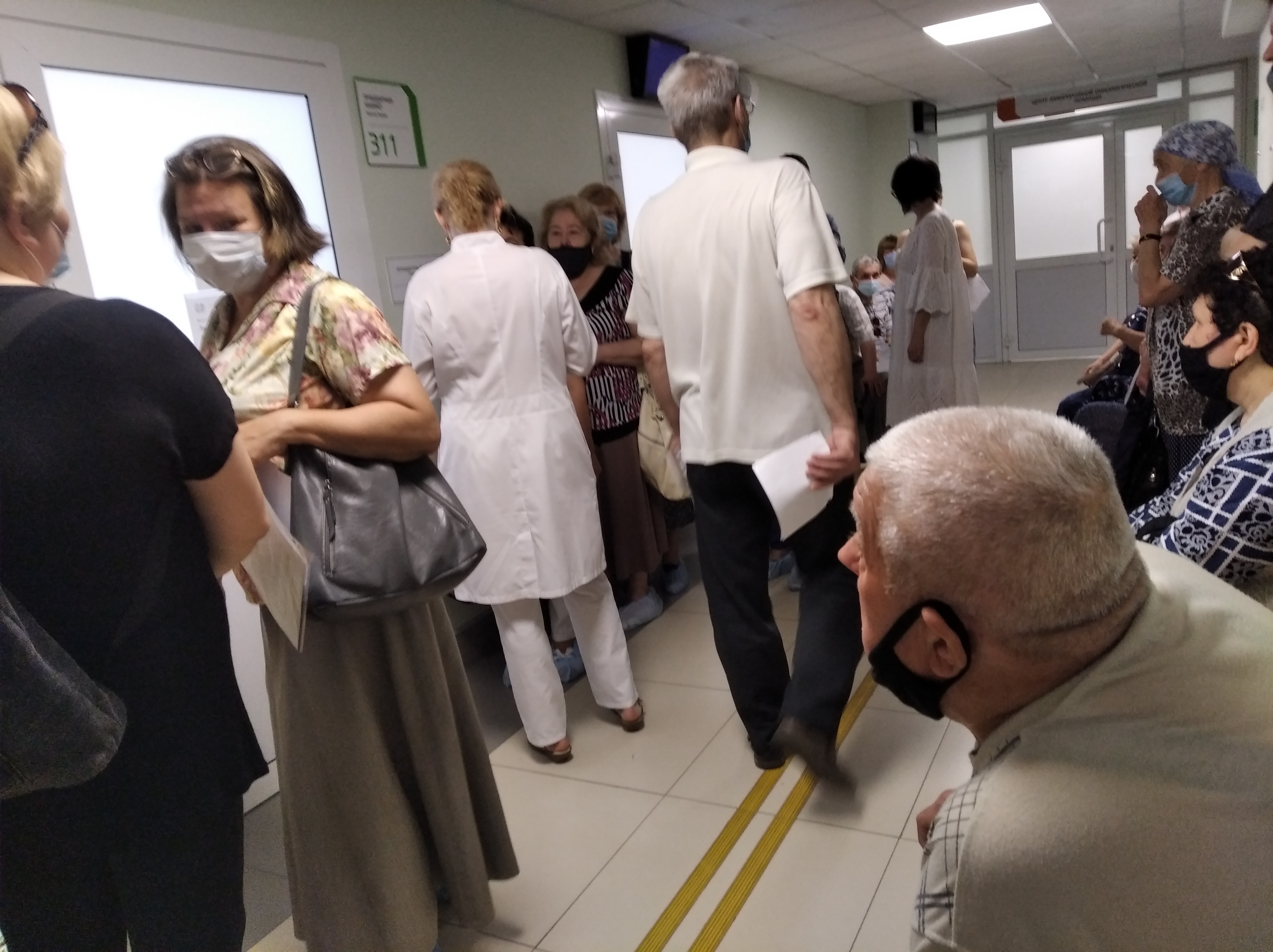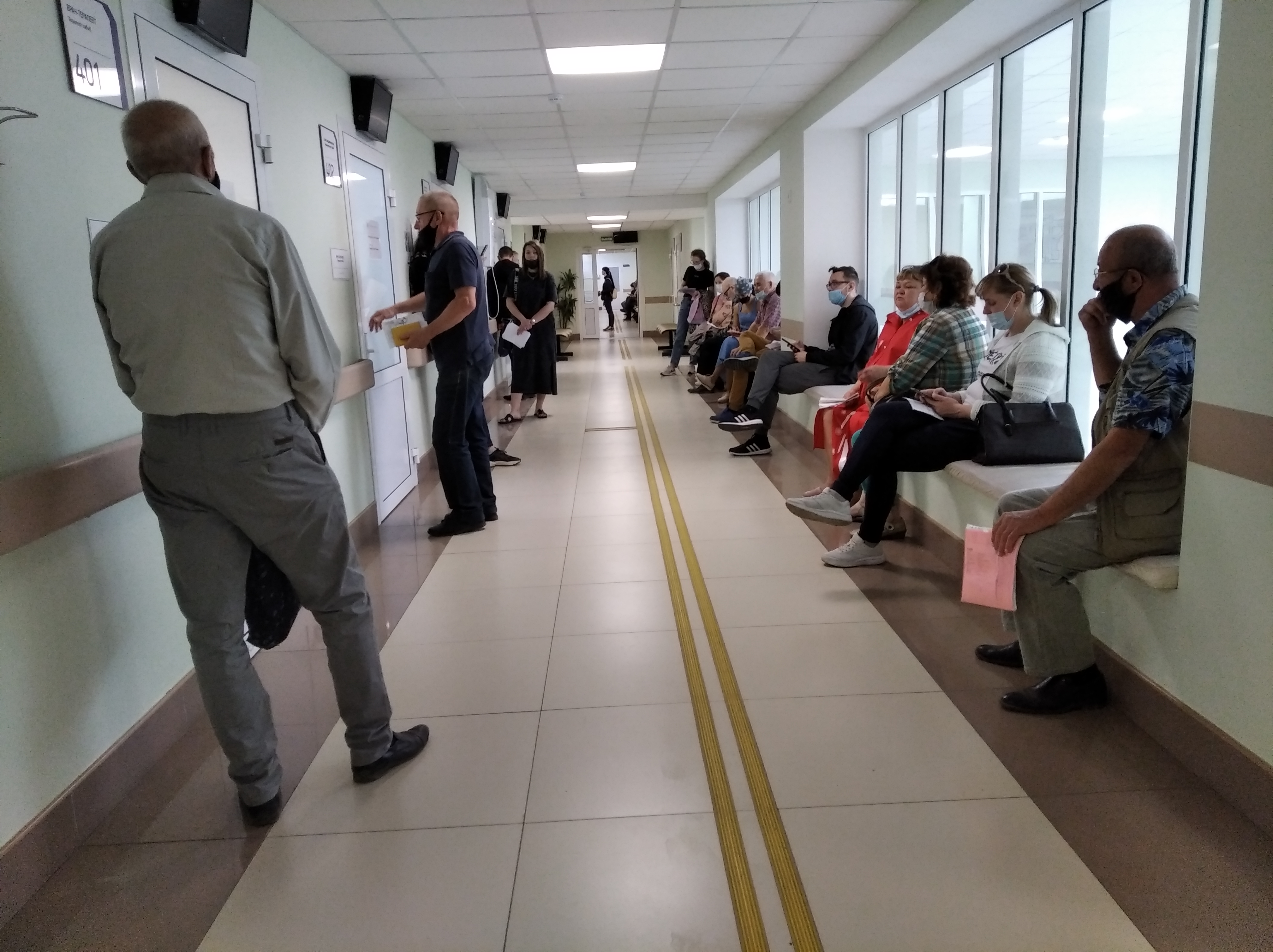Перед несколькими кабинетами на четвёртом этаже скапливается очередь — полтора десятка пациентов, не меньше. Преобладают пожилые люди. Социальную дистанцию почти никто не соблюдает. Маски у многих под носом или на подбородке.