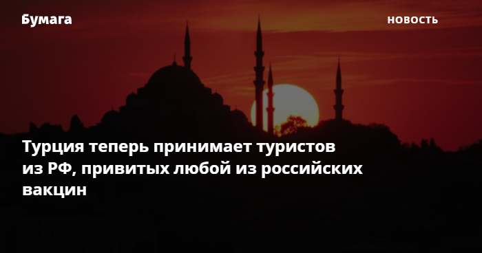 «Туристы из России при въезде в Турцию могут представить сертификат о вакцинации любой зарегистрированной российской вакциной. Важно, чтобы турист прошел полный курс вакцинации не позднее чем за 14 дней до путешествия», — пояснили в ведомстве. Документ должен быть на английском. Ранее было известно, что в Турцию без ПЦР-теста допускают россиян, привитых «Спутником V».