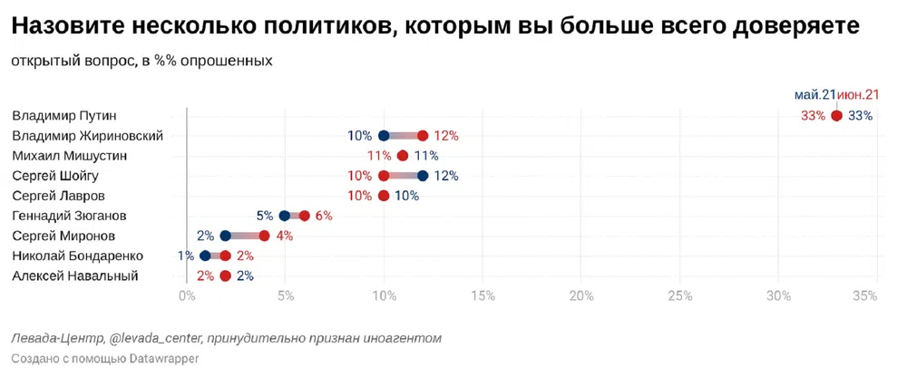 При этом уровень доверия президенту РФ Владимиру Путину не изменился и составляет 33%. «Пятерка лидеров» по уровню доверия помимо Владимира Путина остается неизменной, отмечает «Левада-центр»: это лидер ЛДПР Владимир Жириновский (12%), премьер-министр Михаил Мишустин (11%), министр обороны Сергей Шойгу (10%) и министр иностранных дел Сергей Лавров (10%).