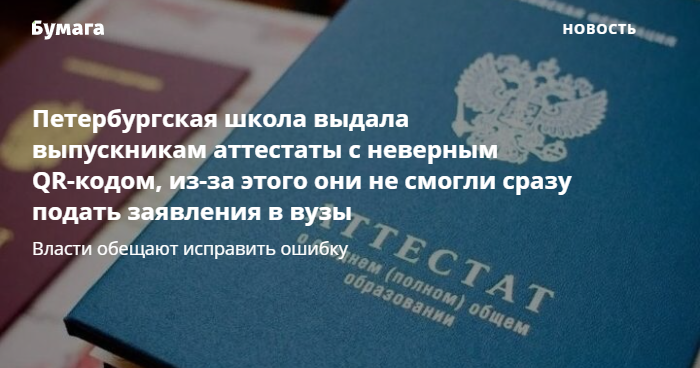 В выданных аттестатах QR-код не совпадал с номером документа, из-за чего выпускники не смогли сразу подать заявления в университеты. Школьные аттестаты маркируются QR-кодами первый год, это делается, чтобы защитить документы от подделок. С помощью кода вузы получают сведения о Ф. И. О., годе рождения и школе выпускника.
