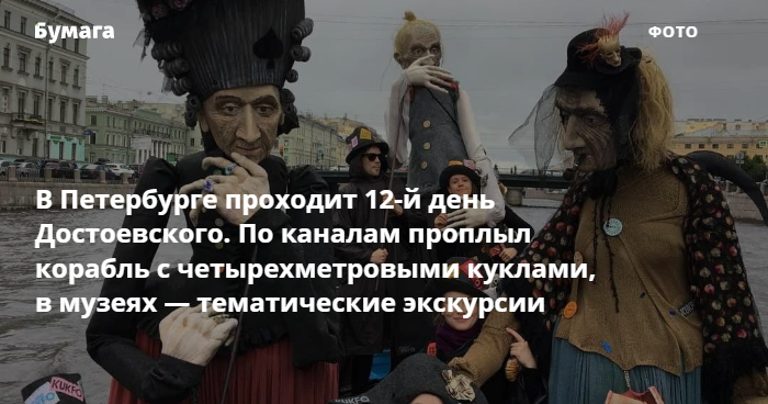 В ночь на 3 июля по рекам и каналам города проплыл кораблик театра «Кукольный формат», на нем были четырехметровые куклы в виде Федора Достоевского и его героини старухи-процентщицы Алены Ивановны, а также других писателей и их героинь-старух.
