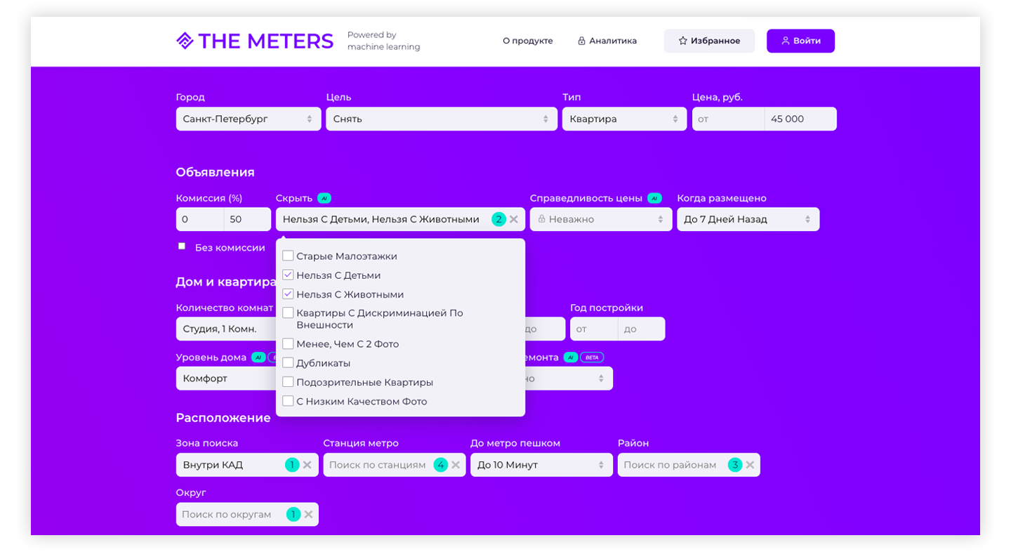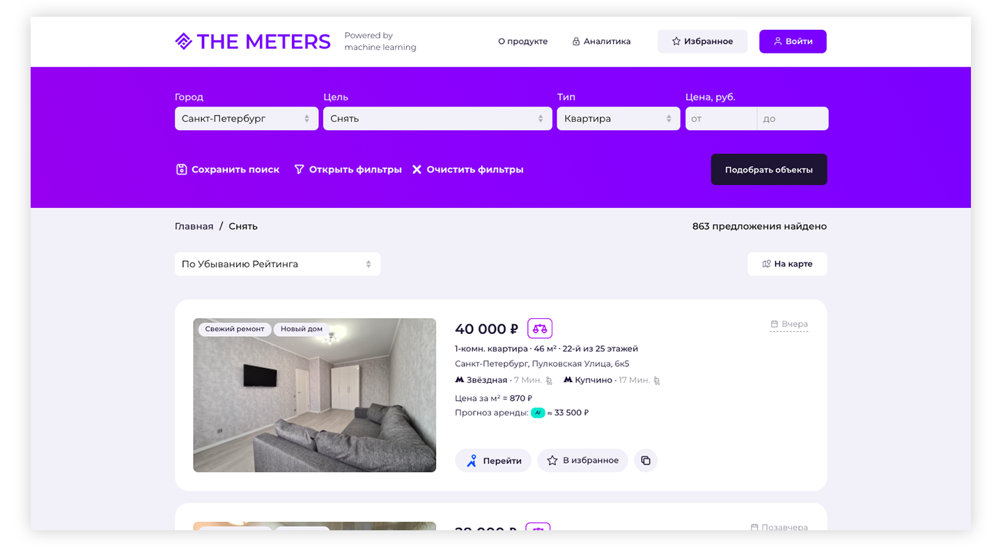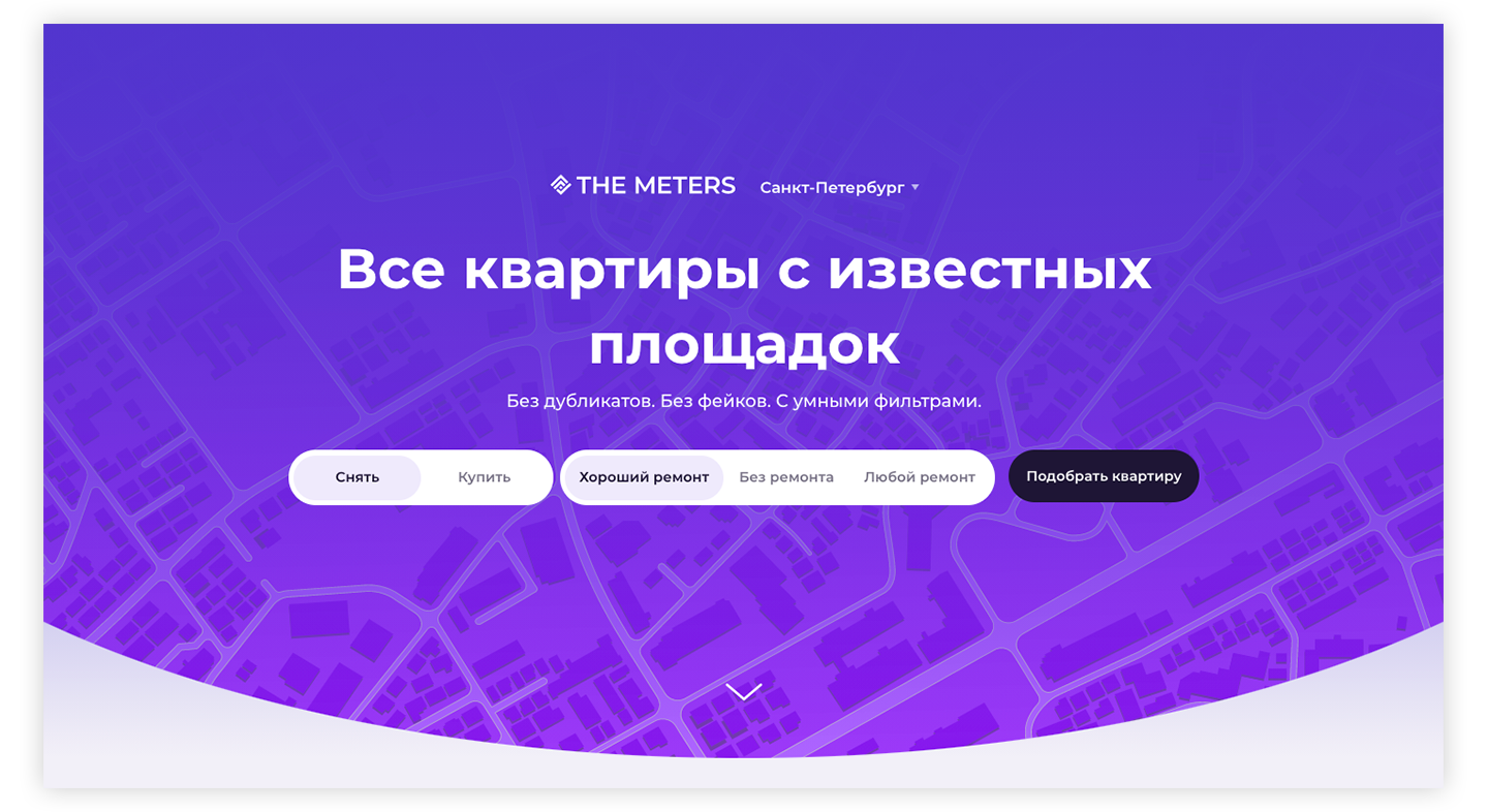 The Meters — маркетплейс для поиска недвижимости, в котором собрана база предложений о продаже и аренде жилплощади из сервисов «Авито», «Циан» и «Яндекс. Недвижимость». Квартиры подбирает искусственный интеллект: он скрывает фейковые и ксенофобные объявления и помогает персонализировать поиск с помощью фильтров.