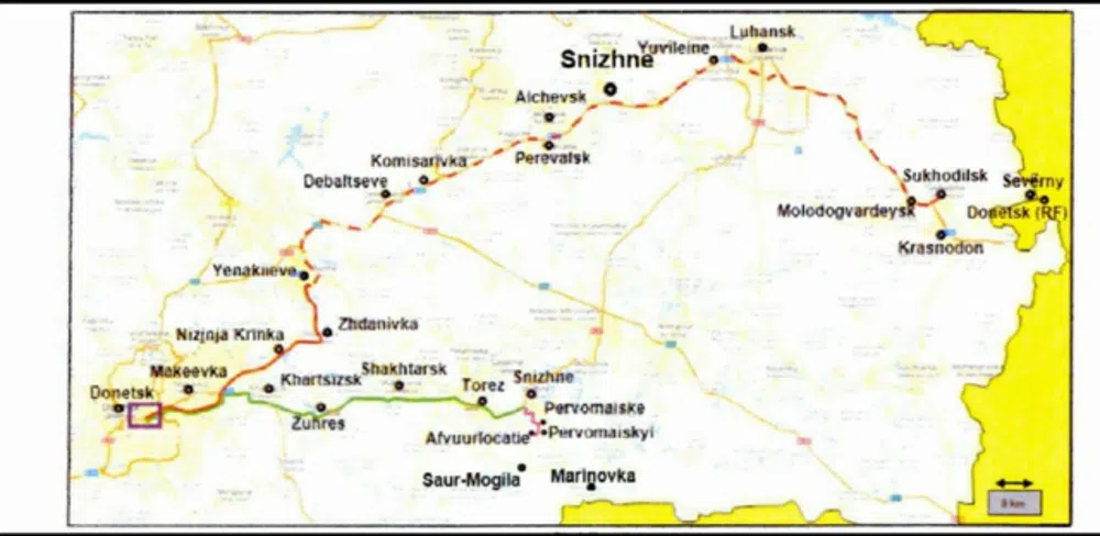 Судя по карте, составленной ССГ, «Бук» вывезен по маршруту от Первомайского в Снежное, потом в Красный Луч, на шоссе Харьков — Ростов, потом перед Дебальцевом круто направо и мимо Перевальска — в Луганск. Далее — на Краснодон и через границу в Донецк Ростовской области России.