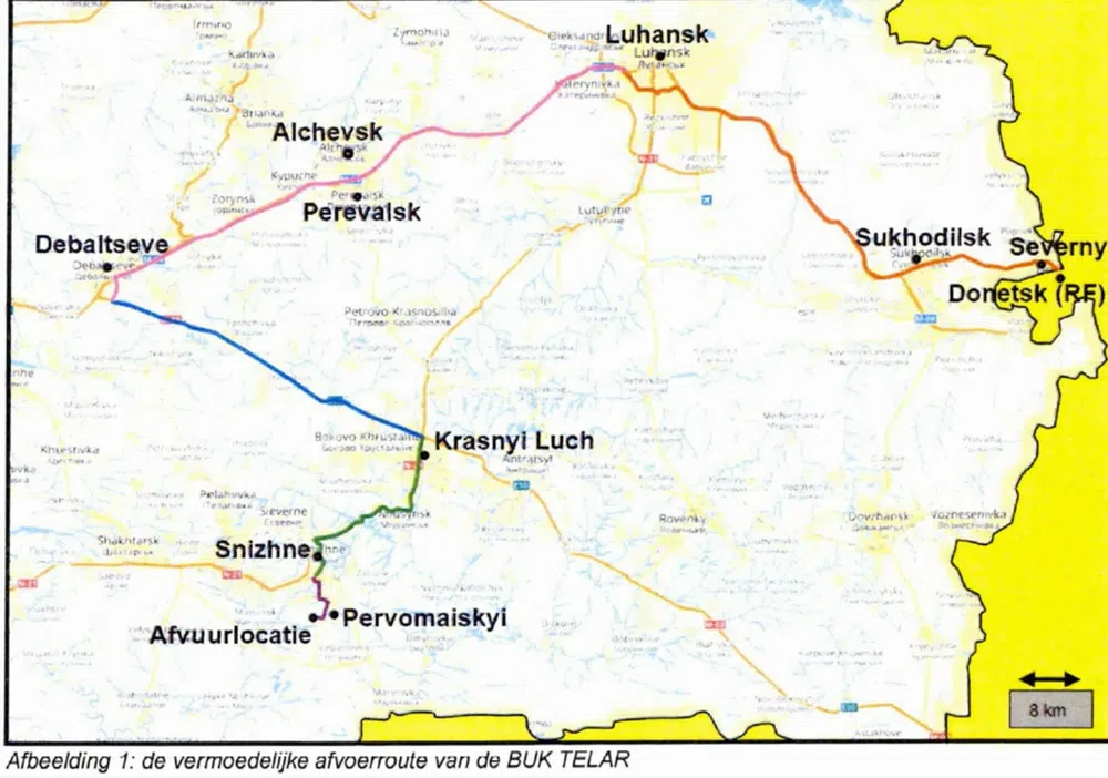 Как следует из доклада ССГ, представленного суду, примерно в 16:20 «Бук» покинул место пуска ракеты в неизвестном на тот момент направлении, уходя от возможного огня противника. Маршрут — на Снежное и обратно в Россию. Это в деле отражено перехватами переговоров, данными передающих антенн, информацией в соцсетях и аналитическими материалами.