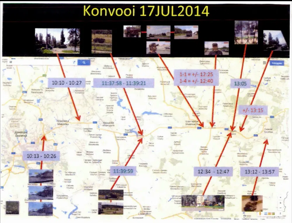 Свидетели подтверждают, что видели в это время у супермаркета «Фуршет» военную машину на гусеничном ходу с ракетами. V54 сказал, что «Бук» потом сгрузили с трейлера, а V49 заявил, что видел Бук у «Фуршета». Некоторые показания расходятся. Какие-то свидетели отказались от показаний, сказав, что забыли. Но большинство независимо друг от друга подтвердили: «Бук» был выгружен с трейлера в обеденное время. И потом уехал вместе с белым грузовиком.