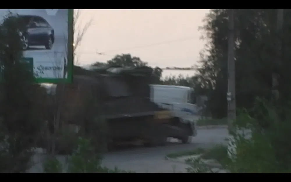 Съемка якобы производилась в городе Красноармейске, что подтверждается находящимся рядом с дорогой баннером. А этот город с 11 мая находится под контролем украинской армии.