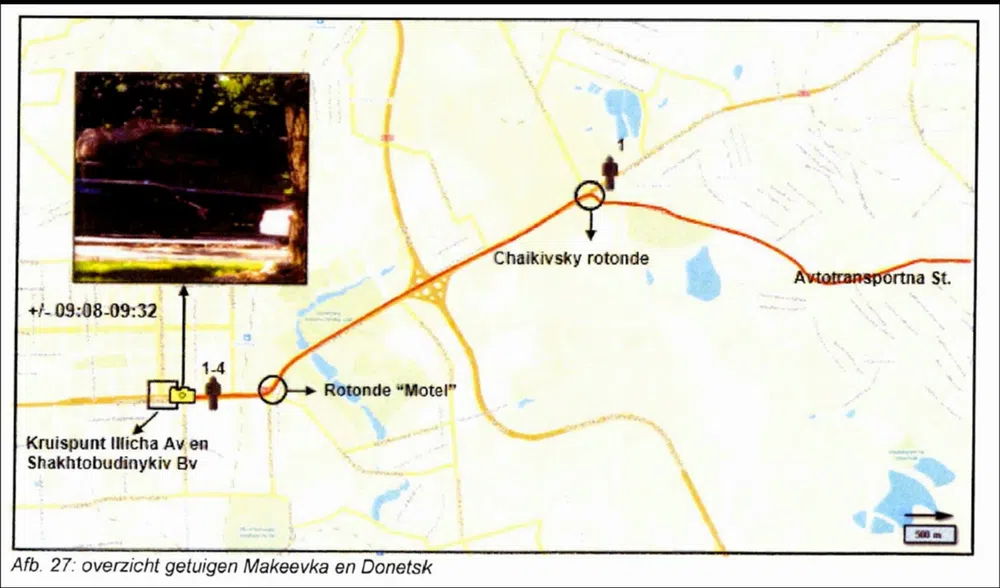 На перекрестке между Макеевкой в Донецком стояли свидетели V43, S27, V52 и S02. Они сказали, что видели белый грузовик «Вольво» и красный трейлер с «Буком». Определили это на основе собственных военных познаний или просмотренных сюжетов телевидения. Видели четыре ракеты: одну — с зеленой головкой, три — с белыми. Сопровождали конвой, по их словам, ополченцы «ДНР» и российские военные.