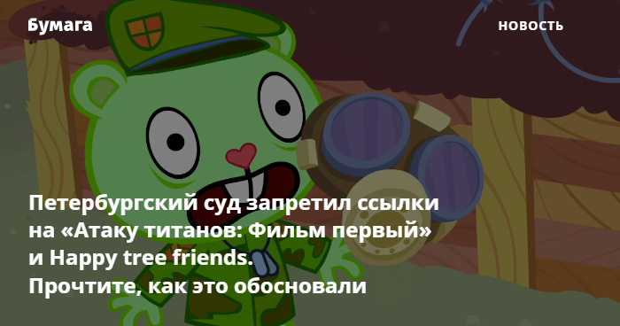 Октябрьский районный суд Петербурга запретил ссылки на три аниме, фильм «Атака титанов. Фильм первый: Жестокий мир» и мультфильм Happy tree friеnds. Об этом сообщили в объединенной пресс-службе судов города.